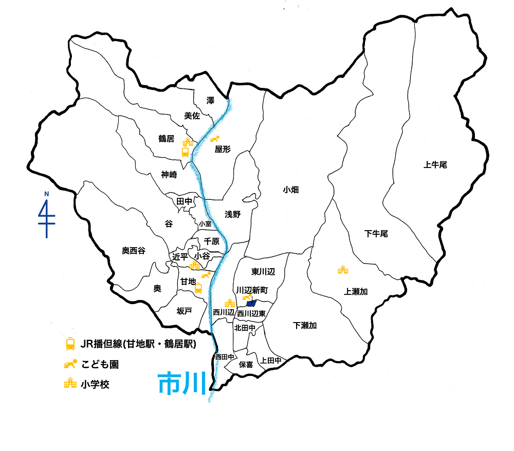いちかわ東こども園(750m)、川辺小学校(1㎞)、市川中学校(2㎞)