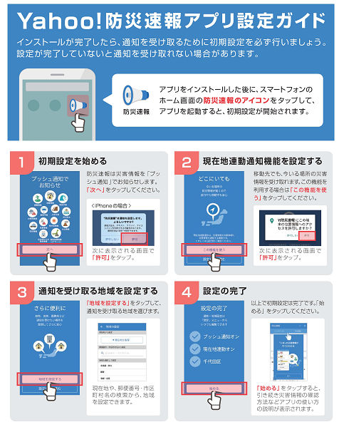 「Yahoo!防災速報アプリ」ダウンロード、初期設定の方法