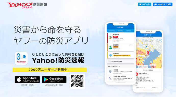 「Yahoo!防災速報」アプリで緊急情報を配信
