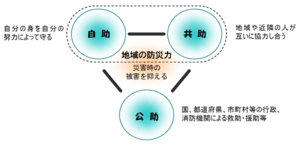 災害から身体と財産を守り、被害を最小限にくい止めるには、「自分たちの地域は自分たちで守る」という信念のもとに、地域住民が団結し、組織的に行動することが大切です。